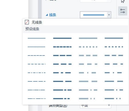 添加线条后,我们点击线条右键属性,在属性里面的的【线条】里选择样式即可。
