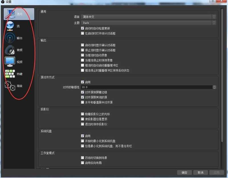 打开设置界面,在这有通用、流、输出、音频、视频、热键、高级多个选项卡。根据自己需求任意切换更改设置即可。