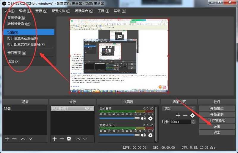 启动OBS Studio,进入主界面。点击文件菜单再选择设置选项即可。或直接单击主界面右侧的设置功能。