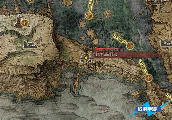 6、从拉斯卡废墟出发,根据图下方向贴着墙壁走,找到湖旁结晶洞窟。