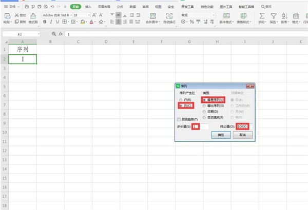 在弹出的对话框中,将序列产生在勾选为【列】,类型为【等差序列】,步长值为【1】,终止值为【10000】: