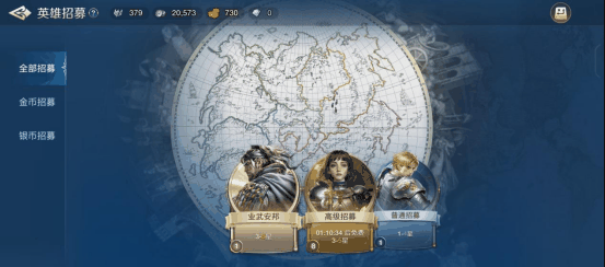 首先,游戏中的招募方式,共分为高级招募、普通招募和其他招募三种,分别对应消耗游戏中金币、银币和文明招募令三种不同的货币资源。其中,高级招募和其他招募均可招募到3~5星级的英雄,普通招募则只能招募到1~3星的英雄。