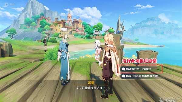 了解情况后,选择对话选项「那还等什么,上船吧!」推进剧情,即可直接来到须弥港口「拜达港」。