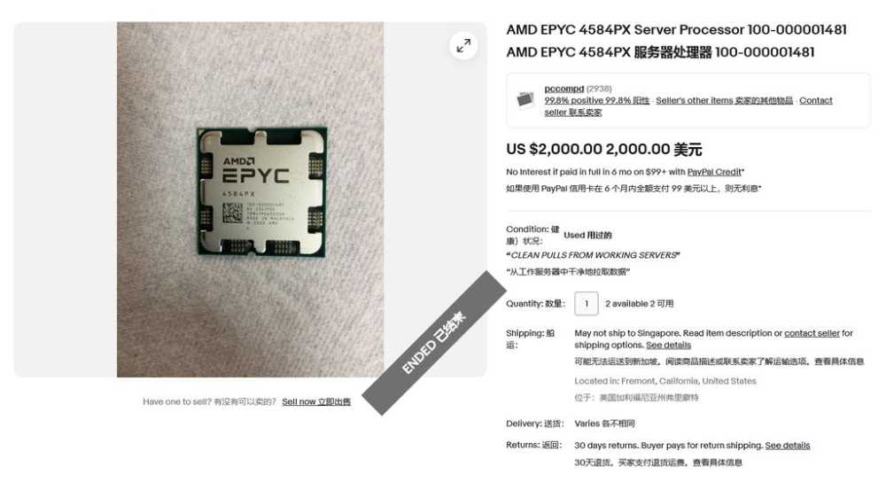 本站查询 eBay 网站,目前并未发现相关产品链接,zcyandrew 随后回帖表示,相关产品目前已经被下架,还分享了“AMD EPYC 4584PX Server Processor 100-000001481”处理器的已下架链接。