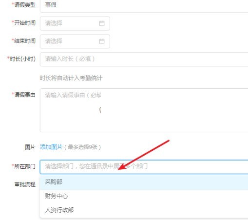 6、这时再去操作审核之类的流程时就会要求选择部门,这样同一个人就可以对多个部门的事务进行处理了。