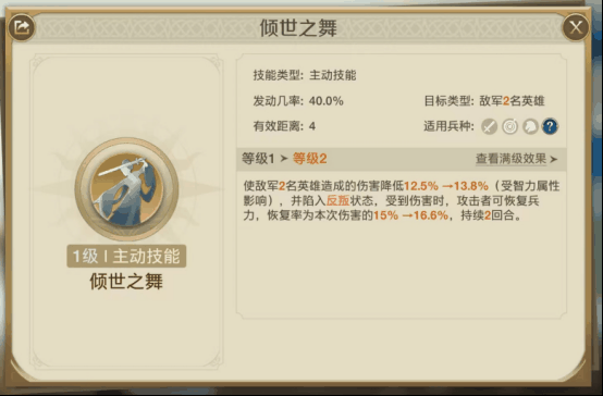 技能是虞美人的亮点所在,一技能使敌军2名英雄造成的伤害降低,并陷入反叛状态,受到伤害时,攻击者可以恢复一定的兵力。这个技能通俗点来说就是先给对方上个降攻debuff,再上个反叛debuff,我方友军攻击这个反叛debuff的敌人会按伤害量恢复一定兵力。这个技能让虞美人可以塞进任何需要续航恢复的队伍,能保证全队的存活率和战损率,弥补了属性上的不足。