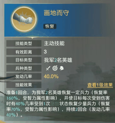 画地为牢,主动技能,有效距离3,发动几率40%,效果是为我军2名英雄恢复一定兵力,并且有几率受伤时得到一次急救效果。
