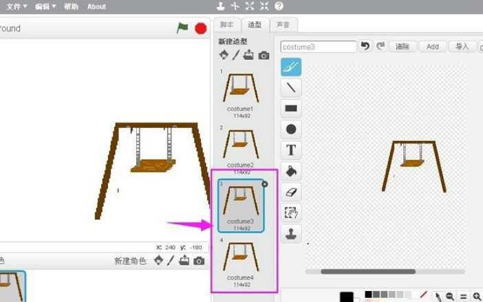 3.打开右侧造型选项中的绘图板,点击画图工具画一个秋千