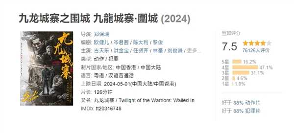 相比之下,票房稍低的《九龙城寨之围城》却逆势上涨,豆瓣评分达到了7.5分,是五一档最强口碑。