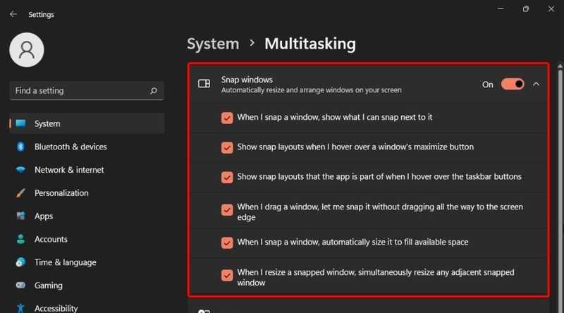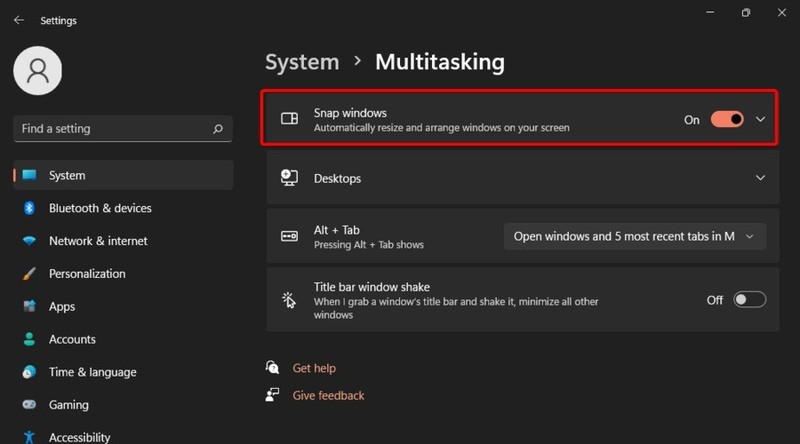 2.转到System,然后导航到Multitasking。