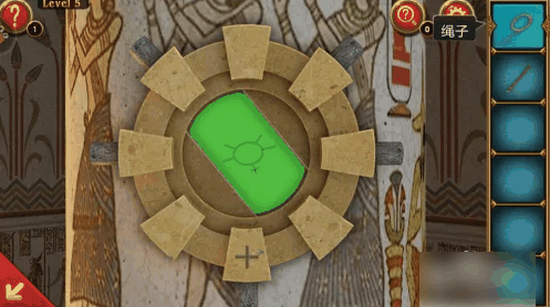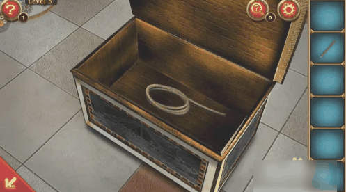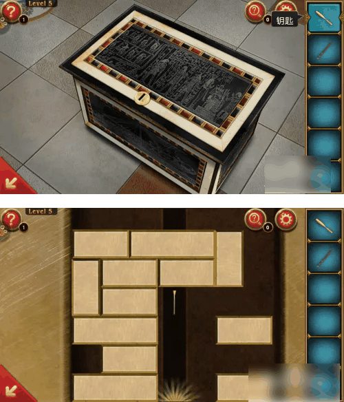 进入2号线索,将钥匙插入宝箱,进入解密谜题。在这个谜题中,移动长条,将上端的撞针按照轨道进入下方的光亮出口处。移动撞针需要两个阶段。解开谜题后,打开宝箱,得到绳子。