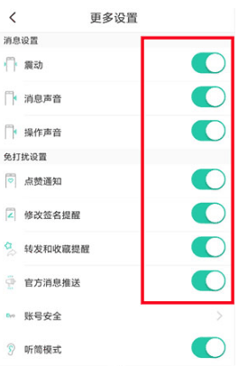 3、最后我们把这个页面里的“震动”、“消息声音”、“操作声音”、“点赞通知”、“修改签名提醒”、“转发和收藏提醒”、“消息推送”服务通通都关掉即可。