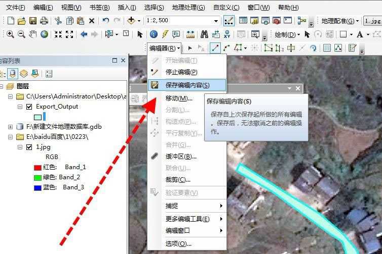 最后,最重要的步骤,就是保存编辑,如果没有这一步前面的操作都是徒劳的,所以,当我们矢量完成后,一定要点击保存编辑:工具栏中的编辑器——保存编辑。