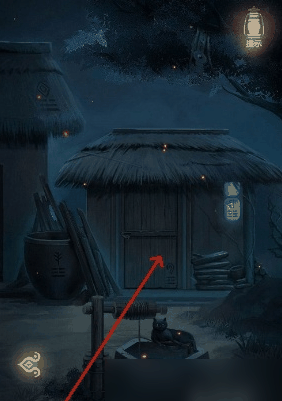 15、返回桌上符咒放上带柄断剑、断剑剑身,使用朱砂笔涂好颜色,得到木剑,使用符咒放走黑猫,对着屋外纸塔使用幡面,根据三个紫色箭头线索打开内屋盒子,得到石莲一杆旗。