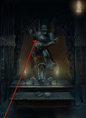 17、输入密码打开房门,点击右侧木箱得到神秘木块,将其放到土地庙牌位下方缺口处得到令牌,将令牌放山神庙神像左手,右手放入伞,身后插入一杆旗,石莲放头上,修好神像即可过关。
