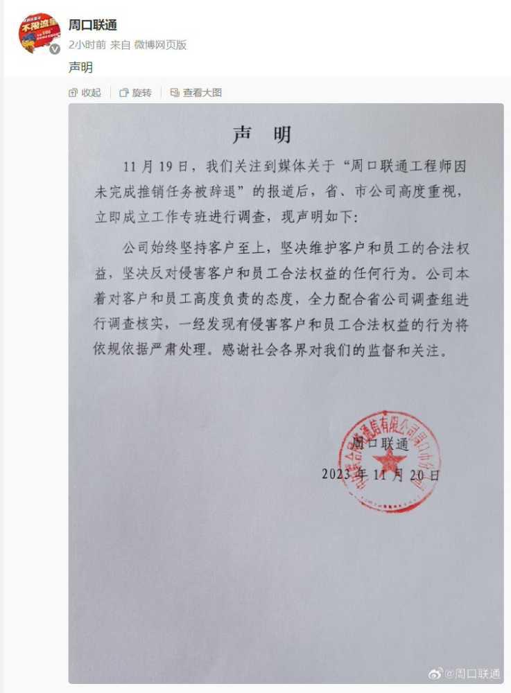 对“工程师未完成推销被辞退”一事,周口联通在微博发布声明,称立即成立工作专班进行调查,全力配合省公司调查组进行调查核实,一经发现有侵害客户和员工合法权益的行为将依规依据严肃处理。