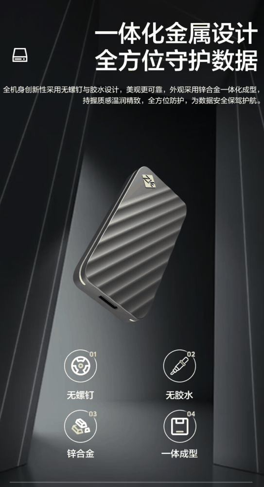 据介绍,这款移动硬盘的硬盘盒部分采用锌合金一体化外壳,采用卡扣设计,便于更换内部硬盘,采用瑞昱主控(具体型号未知)及 USB-C 3.2 Gen 2接口,提供5年质保。