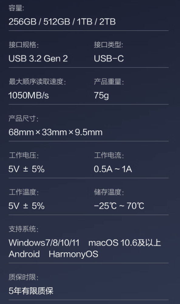 规格方面,这款移动硬盘尺寸为68mm x 33 mm x 9.5mm,重量75 克,本站附具体规格信息如下: