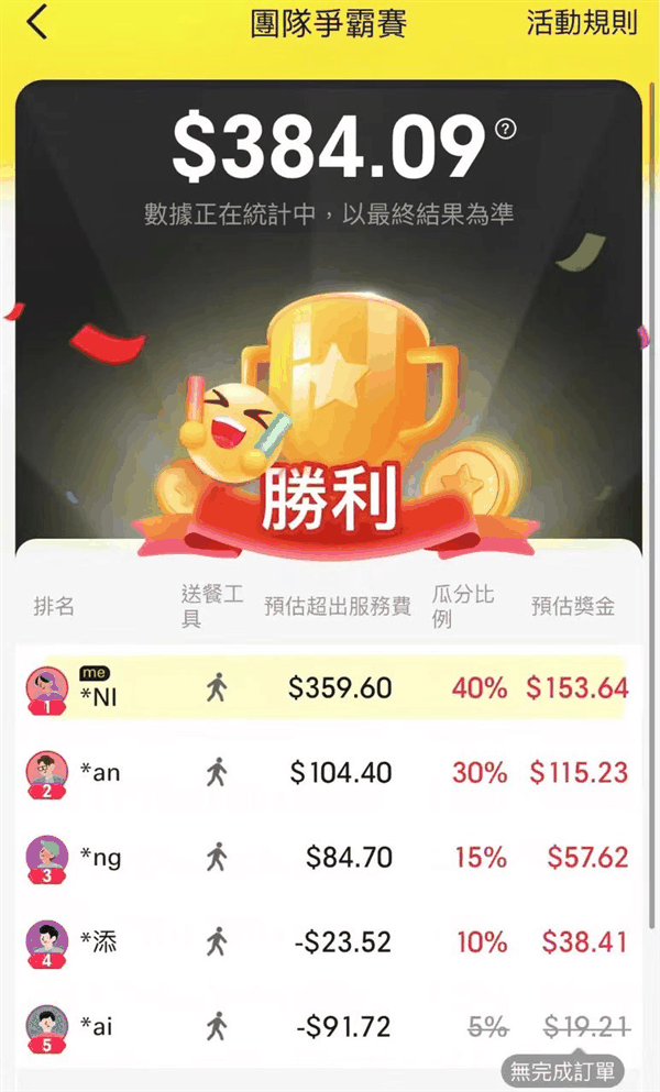 一位 KeeTa 骑手小李( 化名 )告诉我,一单平均到手 30 港币,准时送达的话,平台会有 3 港币左右的准时奖,下雨可能平台还会有补贴,而且官方时不时还会搞一些活动,有额外奖金。