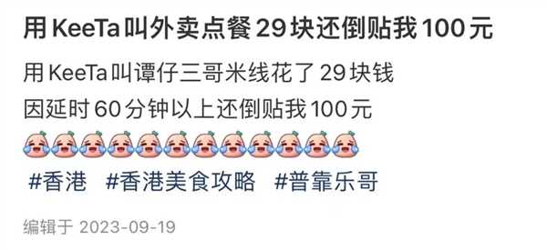 就比如 KeeTa 的准时保,外卖订单超时平台就赔现金券,有老哥点餐花了 29 ,却直接反被倒贴了 100 元。