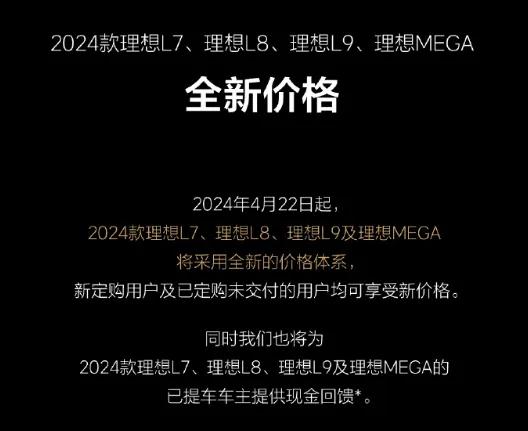 2024年4月22日,理想汽车调整旗下多款车型售价,其中2024款L系列汽车降价1.8~2万元不等(不含理想L6),理想MEGA降价3万元。与此同时,理想也给2024款车型的老车主提供了等额现金退款。