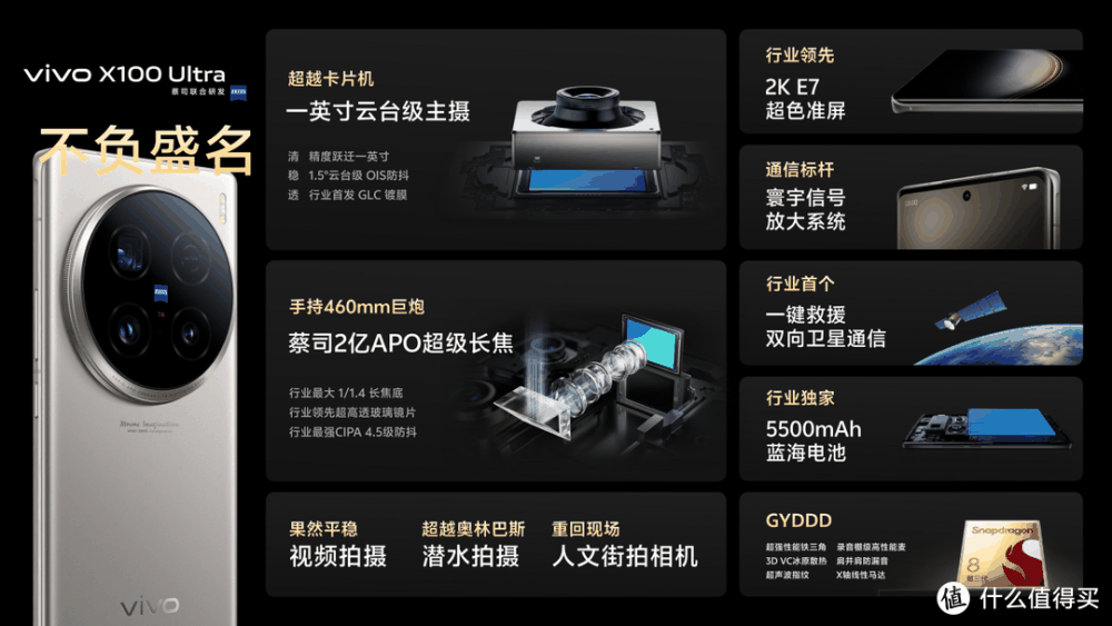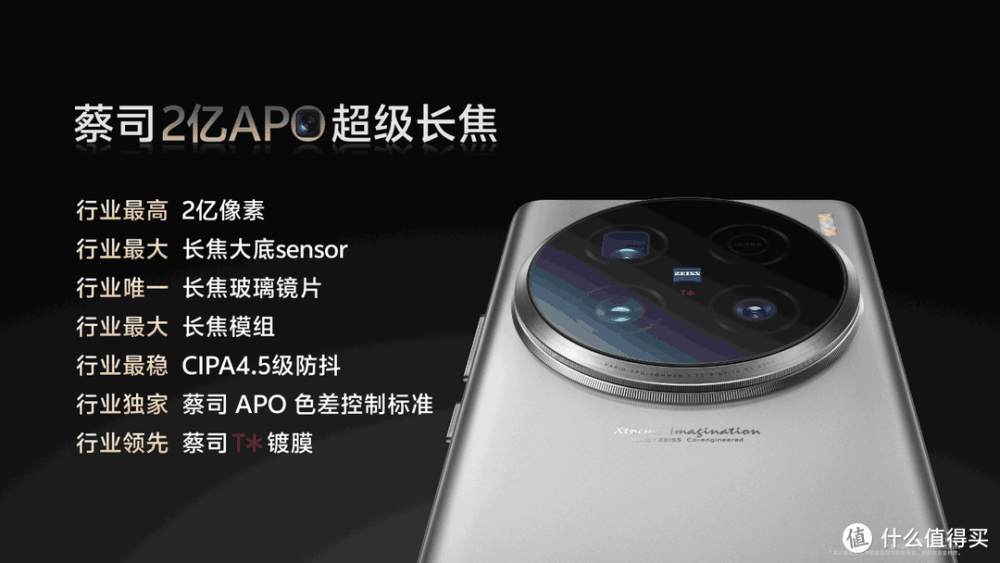 vivo X100 Ultra搭载同时支持云台级别防抖的一英寸主摄,凭借“行业独家精度跃迁技术”、“行业领先蔡司T*镀膜”、“行业领先大角度OIS防抖”成为行业领先一英寸。与此同时,1.5度的硬件防抖,带来行业领先的视频防抖表现。主摄之外,长焦更加亮眼。vivo X100 Ultra搭载蔡司2亿APO超级长焦,是同时拥有超高像素和大底的长焦摄像头,不仅配备行业领先2亿像素联合研发Sensor,1/1.4″大底长焦,还采用了专业光学玻璃提升光学性能,且该玻璃镜片应用了专业相机同款更低色散材料FCD100,此外还拥有行业领先长焦防抖等级CIPA4.5级等多项行业突破,不断刷新Ultra影像标准。