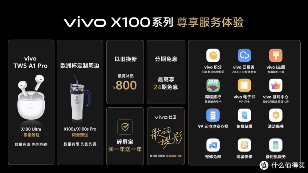 首销期购买vivo X100 Ultra,有机会免费更换原价99元的vivo独家研发超透护眼AR膜;与vivo X100 Ultra共同购买,原价399元的SmallRig专业手柄仅需349元;vivo X100系列新品与vivo Pad3组合加购,可享100元限时优惠。最终规则以店铺公示详细规则为准。