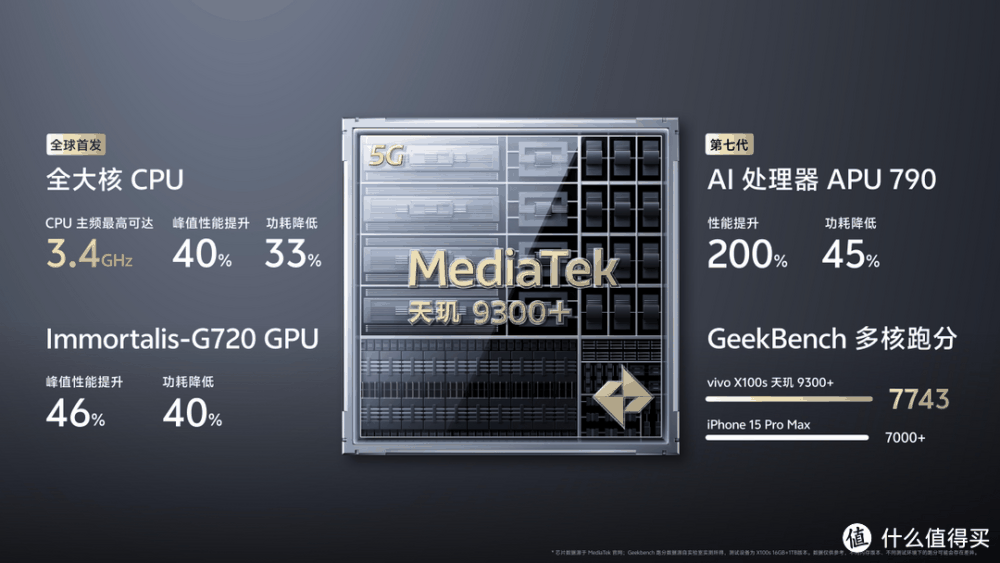vivo X100s不仅颜值出众,而且性能强悍。其全球首发搭载天玑9300+旗舰平台,通过蓝晶芯片技术栈联合研发与调校,使性能再度跃升,全大核CPU峰值性能提升40%,功耗降低33%,GeekBench多核跑分达到7743分,安兔兔跑分直破230万,让vivo X100s直封当前手机市场直屏旗舰的性能杰作。
