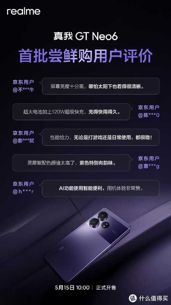 从目前首批尝鲜购的用户评价来看,确实在2000段位机型中,真我GT Neo6都是大家可以闭眼入的存在!特别是还直接价保618确实让人安心。5月15日上午10点,真我GT Neo6将迎来首销时刻,这一波确实可以闭眼冲!