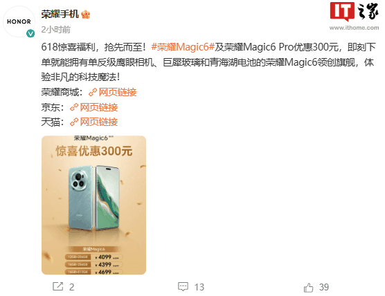 5 月 14 日消息,荣耀今日官宣 Magic6 系列手机 618 优惠活动,荣耀 Magic6/ 6 Pro 降价 300 元。