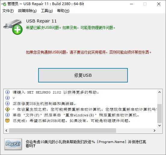 3、如果电脑中的USB设备存在问题,打开 USB Repair 工具后,直接点击“修复USB”,之后耐心等待修复完成即可。