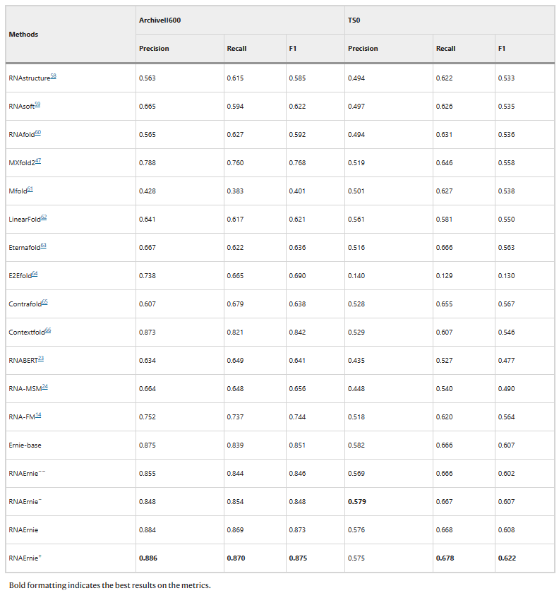 图示:RNAErnie 使用 ArchiveII600 和 TS0 数据集在 RNA 二级结构预测任务上的性能。(来源:论文)