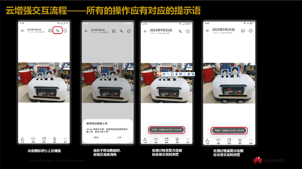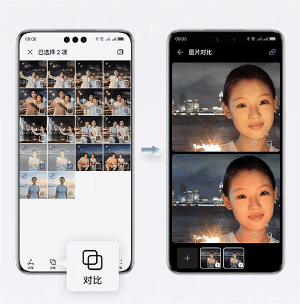 此外,还能长按选择2张照片,使用“对比”功能放大细节,查看云增强前后的清晰效果对比。