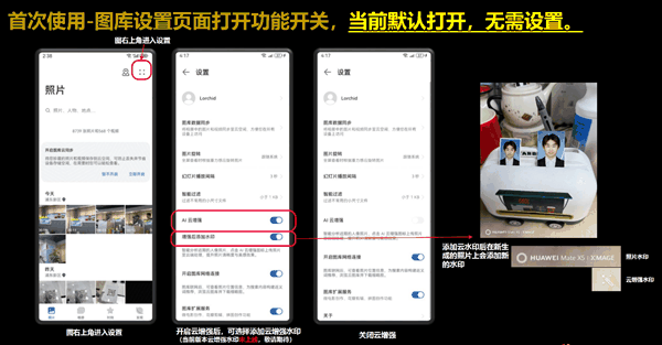 首次使用,只需要点击图库“设置”,打开“AI云增强”。这时打开相机,使用后置摄像头普通拍照模式,使用XMAGE原色风格拍摄单人或多人照片,然后在图库中打开所拍照片,点击右上角“魔法棒”图标,就能开启AI云增强,对照片进行“魔法”修图了。