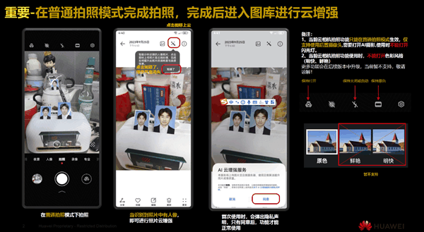 可能有人会问,这和普通的软件P图有何区别呢?顾名思义,华为业界首创的这项AI云增强技术是通过云端智能优化。当照片原图及相关数据一键上传云端后,通过云端亿级参数大模型算法(包括人像增强算法、背景增强算法、亮色增强算法),就能智能分析所拍摄的照片,捕捉并恢复隐藏在图像中的微小细节。无论50人大合影还是单人照,都能让人像肤质更细腻、发丝细节更清晰,最终生成云增强高清图。而且它可以覆盖主摄,广角,长焦(支持20x以下),各种场景下拍的人像图片都能优化。