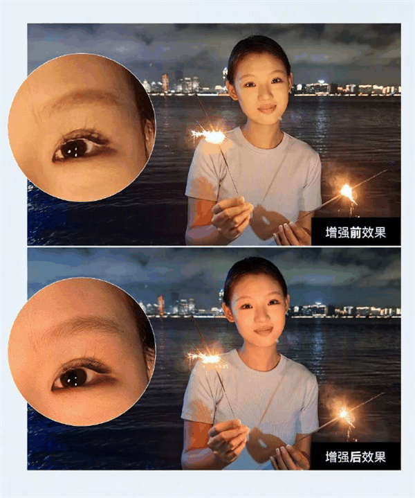 以人像为例,即便特写放大也清晰,不仅五官轮廓更加突出,肤质也更加细腻。夜景人像,细节也更加丰富,尤其是没增强前“糊成一片”的眉毛细节,也变得根根分明,效果立竿见影。