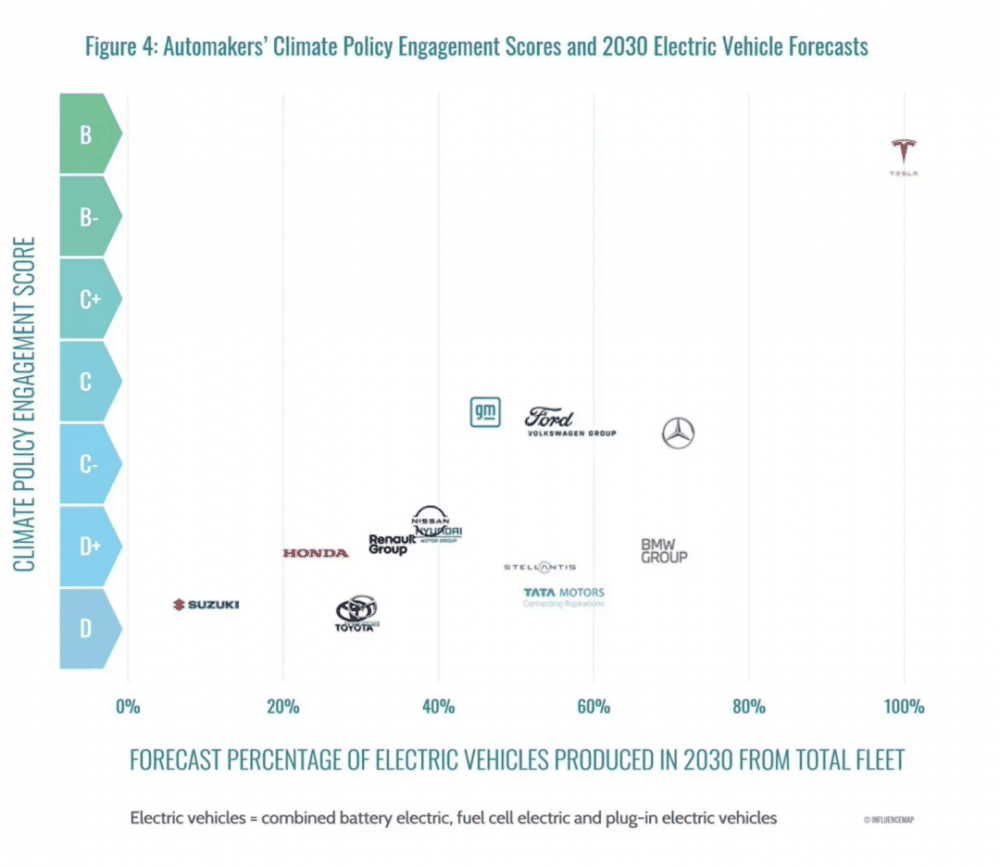 因此,根据 InfluenceMap 的评估,没有一家汽车制造商的得分能达到 B 级,如果忽略特斯拉,则没有一家能达到 C 级。与此同时,该智库指出,在接受评估的 15 家公司中,只有特斯拉、奔驰和宝马 3 家正在按计划生产足够数量的绿色环保汽车,以避免气候灾难的发生。