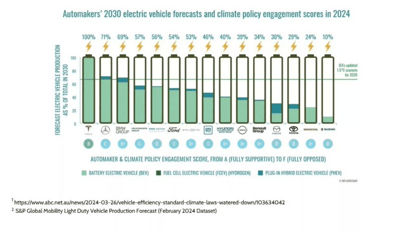InfluenceMap 主任 Ben Youriev 表示:“尽管全球电动汽车销量持续增长,但落后型汽车制造商,尤其是日本车企,为了保护其燃油发动机技术投资而进行的负面宣传,仍然是阻碍科学气候政策的最大障碍之一。”
