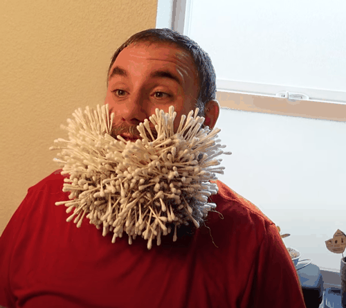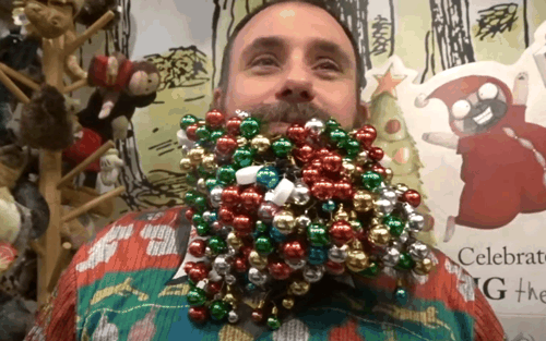 他把这些东西装到胡子上花了两个多小时,拆下来又花了一个多小时,圣诞老人都得从他这儿进货,造型就跟长了一脸藤壶似的。