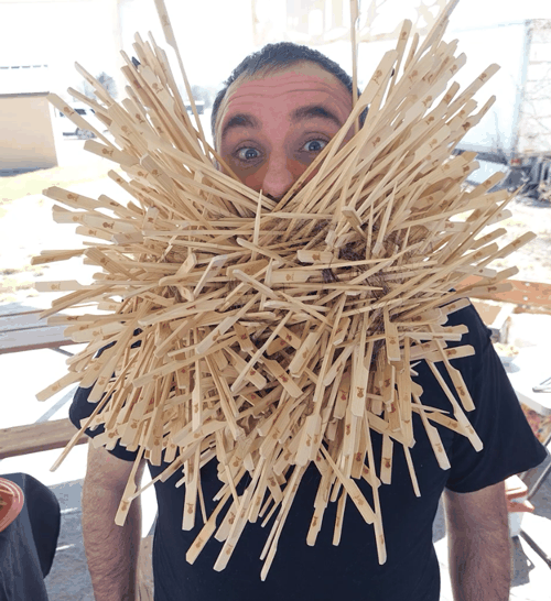 胡子上挂着的签子比他的头还大,这造型很像游戏里的人物。签子之间层层叠加,小鸟看完号召全家过来学习如何搭鸟窝。