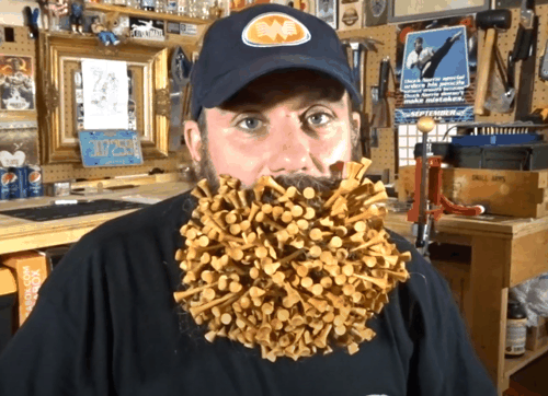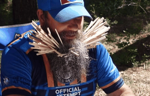 这时候往往有机智的网友会吐槽,如果他在胡子里插点别的东西,那是不是又创造了新的世界纪录。你别说还真别说,Joel Strasser就是这么做的。事实上他是一位很喜欢打破世界纪录的人,而且每项挑战都会在自己的胡子上做文章。