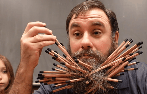 同一年又一次挑战了插铅笔,只不过这次是限时挑战,拿下了「1分钟之内在胡子里插入铅笔最多」的世界纪录,他搞了59根铅笔。