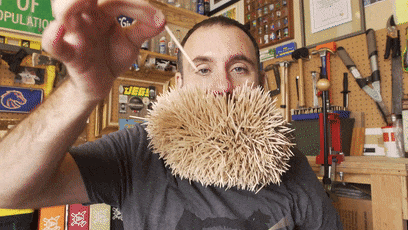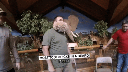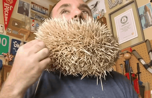 他的挑战之旅似乎开始于2018年,那时候他完成了一个很离谱的世界纪录,就是「在胡子里塞牙签」。