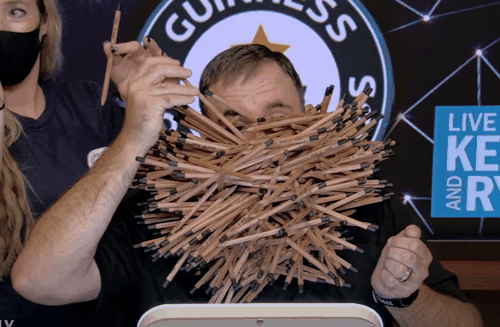 后续基本一年最少拿下两个世界纪录,2021年是往胡子里插铅笔,插了456根,眼睛都挡住了,还在往上堆呢,我感觉能把学校门口的小卖部买脱销。