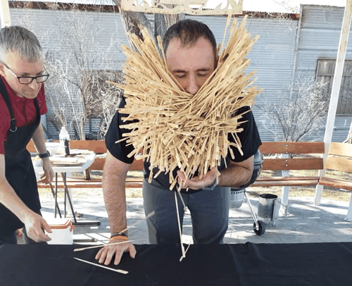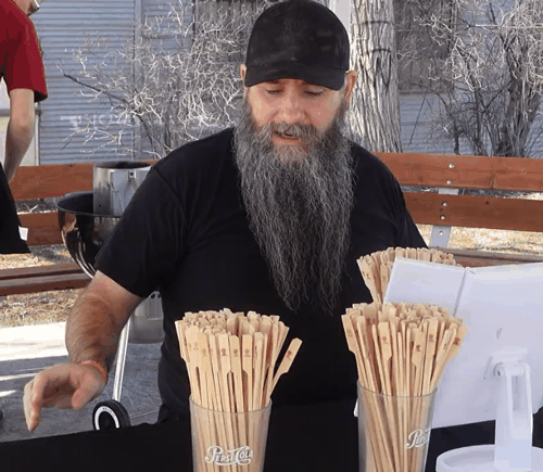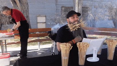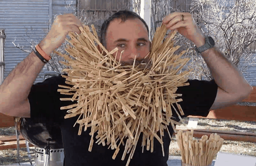 他挑战这项纪录的过程像是去郊游,旁边的人在烧烤,他就在那玩胡子。整个过程就像是在叠积木,把签子一根根塞进胡子里,随着烧烤签子的数量越来越多,他整个人看起来就像是个大号刺猬: