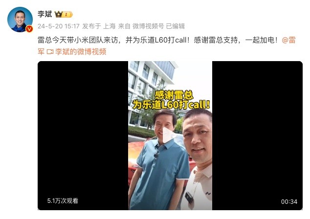 【科技号】5月20日消息,今日雷军率领小米汽车团队到访蔚来,蔚来CEO李斌亲自接待,并在社交媒体发文表示,“雷总今天带小米团队来访,并为乐道L60打call!感谢雷总支持,一起加电!”