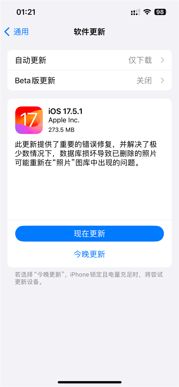 叮当号5月21日消息,今天凌晨,苹果发布iOS 17.5.1正式版更新,本次更新距离上次发布间隔7天。