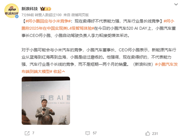 据媒体报道,对于小鹏可能会与小米汽车的竞争,何小鹏表示,新能源汽车行业从蓝海到红海再到血海,小鹏是经过磨炼的。