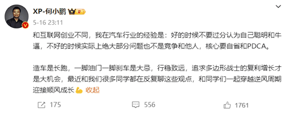 值得一提的是,就在日前,何小鹏发布微博聊起了在汽车行业的创业感受,其表示: