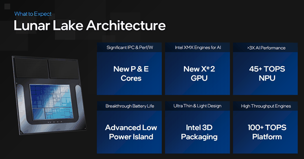 Intel今天正式公布了代号Lunar Lake的下一代移动平台超低功耗处理器,它将与代号Arrow Lake的下一代全平台高性能处理器相辅相成,构成第二代酷睿Ultra家族。